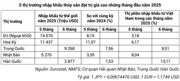 Trong những tháng đầu năm nay, nhu cầu nhập khẩu thủy sản tại nhiều thị trường lớn trên thế giới ghi nhận xu hướng tăng trưởng tích cực. Tại thị trường Liên minh châu Âu (EU), theo số liệu từ Cơ quan Thống kê châu Âu (Eurostat), kim ngạch nhập khẩu thủy sản từ các nước ngoài khối trong 5 tháng đầu năm 2025 đạt 14,57 tỷ USD, tăng 8,15% so với cùng kỳ năm 2024. Trong đó, thị phần thủy sản Việt Nam chiếm 3,18% – một con số khả quan trong bối cảnh cạnh tranh gay gắt từ các nước sản xuất lớn như Na Uy, Ecuador và Trung Quốc.