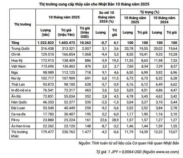 Tính chung 10 tháng năm 2025, thị phần thủy sản của Việt Nam tại Nhật Bản đạt 7,6% về lượng và 8,54% về trị giá, đưa Việt Nam trở thành nhà cung cấp thủy sản lớn thứ tư cho thị trường này. Các mặt hàng thủy sản Việt Nam được người tiêu dùng Nhật Bản ưa chuộng nhờ chất lượng ổn định, chủng loại đa dạng và khả năng đáp ứng các yêu cầu nghiêm ngặt về an toàn thực phẩm.