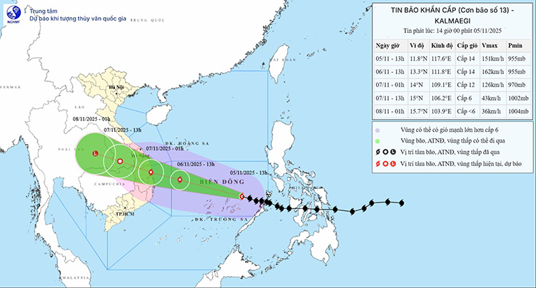 (TSVN) – Bão số 13 (Kalmaegi) đã mạnh lên cấp 13-14, giật cấp 17 ngay trên Biển Đông, cách đảo Song Tử Tây 360km. Đây là cơn bão rất mạnh, di chuyển nhanh (20-25km/h). Dự báo bão sẽ giữ cường độ cấp 14 trên biển và đổ bộ đất liền từ Quảng Ngãi đến Đắk Lắk.