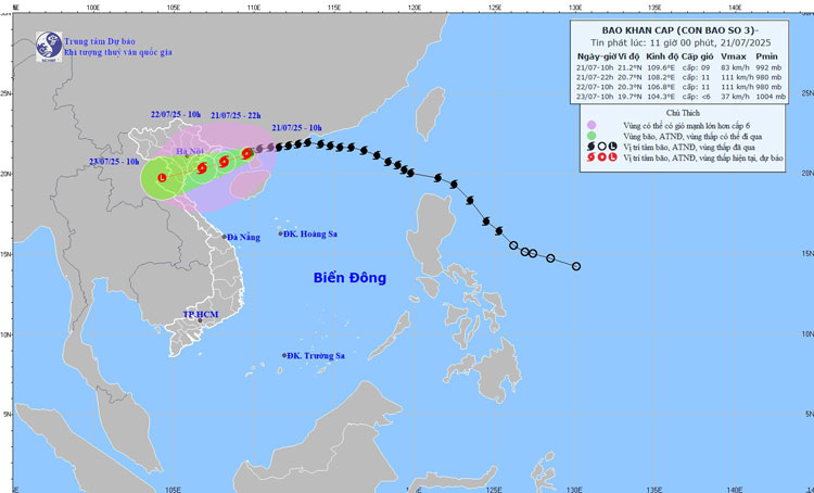 Theo Trung tâm Dự báo Khí tượng Thủy văn Quốc gia, tính đến 14h00 ngày 21/7, vị trí tâm bão số 3 ở khoảng 21,1° Vĩ Bắc; 109,1° Kinh Đông, cách Quảng Ninh khoảng 120km, Hải Phòng 260km, Hưng Yên 280km và Ninh Bình khoảng 310km về phía Đông Đông Bắc. Sức gió mạnh nhất của bão đạt cấp 9-10 (75-102km/h), giật cấp 12. Bão đang di chuyển theo hướng Tây Tây Nam với tốc độ 10-15km/h.