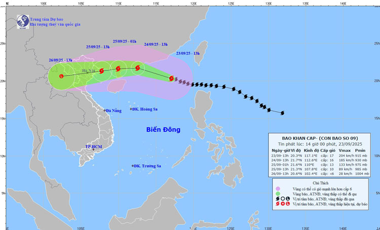 Theo Trung tâm Dự báo Khí tượng Thủy văn Quốc gia, vào hồi 13 giờ ngày 23/9, tâm siêu bão số 9 được xác định tại vị trí 20,3 độ Vĩ Bắc và 117,1 độ Kinh Đông, ngay trên vùng biển phía Đông Bắc của khu vực Bắc Biển Đông. Sức gió mạnh nhất ở vùng gần tâm bão đạt cấp 16 – 17 (tương đương 184 – 221km/giờ), giật trên cấp 17, và bão đang di chuyển theo hướng Tây Tây Bắc với tốc độ khoảng 20km/h. Trong những ngày tới, siêu bão được dự báo sẽ di chuyển nhanh và suy yếu dần nhưng vẫn duy trì cường độ rất mạnh. Đến 13 giờ ngày 24/9, bão được dự báo sẽ ở trên vùng biển ven bờ tỉnh Quảng Đông (Trung Quốc), cách Móng Cái khoảng 480km, với sức gió vẫn còn ở cấp 15 – 16. Sau đó, bão sẽ tiếp tục suy yếu còn cấp 12-13 khi đi qua bán đảo Lôi Châu vào rạng sáng 25/9. Dự kiến đến 13 giờ ngày 25/9, tâm bão sẽ nằm trên vùng biển ven bờ Quảng Ninh – Hải Phòng với sức gió mạnh cấp 9 – 10, giật cấp 12, trước khi đi sâu vào đất liền và suy yếu thành một vùng áp thấp trên khu vực Thượng Lào vào ngày 26/9.