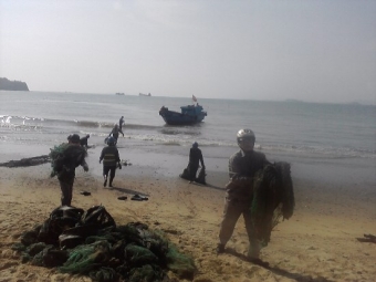 Sáng 12/3, Công ty cổ phần Môi trường đô thị Quy Nhơn tiếp tục tổ chức vớt, thu gom được gần 0,5 tấn chà tôm, lưới cản đánh cá của ngư dân thả khai thác thủy sản trái phép tại khu vực bãi tắm biển Quy Nhơn dọc đường Xuân Diệu (ảnh). Đây là đợt thu gom chà tôm, lưới cản lần thứ 3 sau Tết Nguyên đán Ất Mùi 2015.