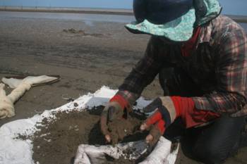 Gần 1 tháng nay, mỗi ngày có hàng trăm người dân đi dọc bãi biển dài khoảng 10km thuộc 2 xã Dân Thành và Đông Hải (huyện Duyên Hải, Trà Vinh) để cào nghêu giống bán lại cho thương lái.