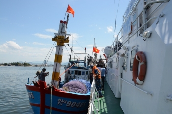 Chiều ngày 3/7, tàu Cảnh sát Biển 2013 (Bộ Tư lệnh vùng Cảnh sát Biển 2) đã đưa tàu cá ĐNa 90485 TS cùng 10 ngư dân về cảng nhà máy X50 (TP Đà Nẵng) an toàn.