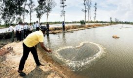 Hàng ngàn người dân mang theo các dụng cụ đánh bắt cá truyền thống dầm mình dưới nước tham gia lễ hội bắt cá cầu may giữa tiết trời nắng gắt 39 – 40 độ C.
