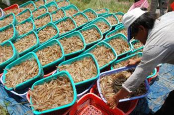 Hiện, tại thị xã Vĩnh Châu, huyện Trần Đề, Mỹ Xuyên, thương lái về tận ao thu mua tôm của các hộ dân với giá cao hơn khoảng 5.000 đồng/kg hơn so với trước Tết Nguyên đán.