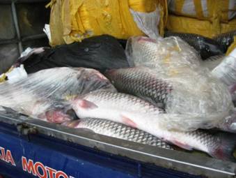 Kiểm tra một chiếc xe tải, lực lượng công an phát hiện 12 thùng xốp bên trong đựng cá trắm đông lạnh không rõ nguồn gốc xuất xứ. Đáng chú ý, trên bao bì đựng cá đều ghi chữ Trung Quốc.