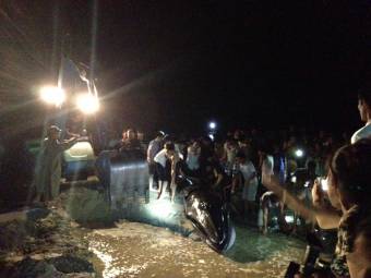 Người dân huyện đảo Cô Tô vừa giải cứu thành công 1 con cá voi dài khoảng 7 mét, nặng hơn 2 tấn bị mắc cạn trên bờ biển.