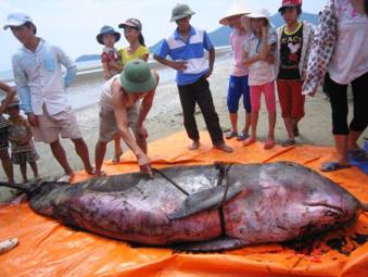 Sáng 14/5, tại bờ biển xã Thạch Bằng, huyện Lộc Hà, ngư dân đã phát hiện một con cá voi lớn bị mắc cạn.
