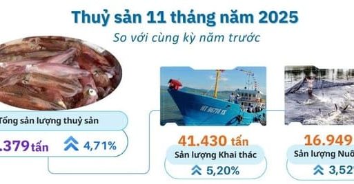 (TSVN) – Sản xuất thủy sản trong tháng và 11 tháng vẫn duy trì mức tăng trưởng khá ổn định. Dù sản lượng nuôi trồng giảm nhẹ so với tháng trước, hoạt động khai thác lại tăng mạnh, giúp tổng sản lượng chung đạt mức cao.