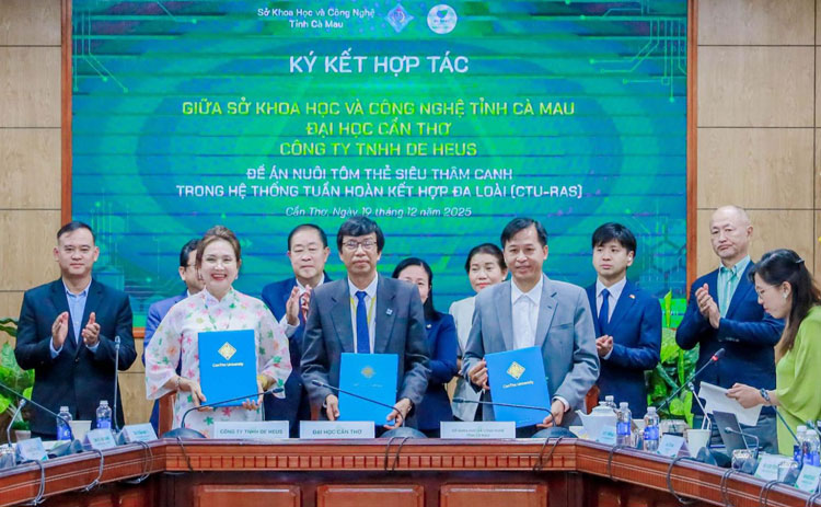 Đại học Cần Thơ ký kết cùng Sở KH&CN tỉnh Cà Mau và Công ty TNHH De Heus về triển khai Đề án Nuôi tôm siêu thâm canh CTU-RAS tại địa bàn tỉnh Cà Mau