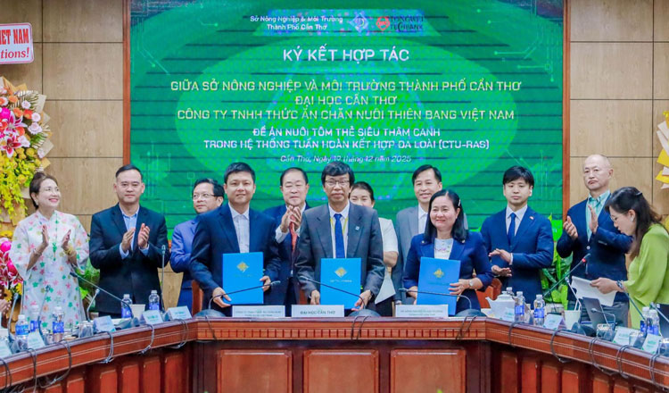Đại học Cần Thơ ký kết cùng Sở NN&MT thành phố Cần Thơ và Công ty TNHH Thức ăn chăn nuôi Thiên Bang Việt Nam về triển khai Đề án Nuôi tôm siêu thâm canh CTU-RAS