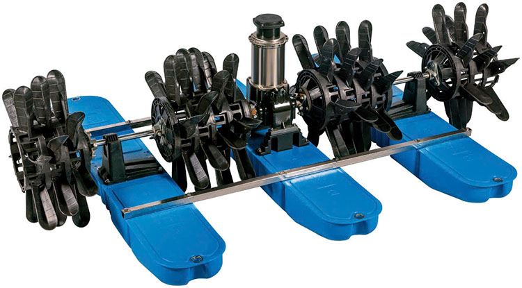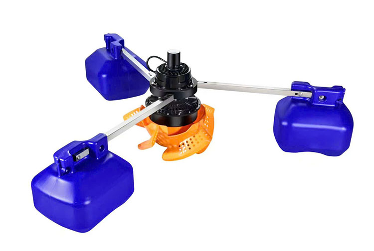 Bên cạnh công nghệ sục khí lơ lửng, hệ thống quạt nước tạo dòng bề mặt cũng đóng vai trò quan trọng không kém. Các tổ hợp quạt nước hiện đại được thiết kế kết hợp hệ thống phao nổi chịu lực đồng bộ. Hệ thống cánh quạt bằng nhựa kỹ thuật đa dạng về kiểu dáng – từ cánh quạt hở truyền thống đến thiết kế cánh kín tối ưu lực cản – giúp khuấy động bề mặt nước mạnh mẽ. Lực nước từ hệ thống quạt không chỉ làm tăng diện tích tiếp xúc để trao đổi ôxy, mà còn tạo ra dòng chảy vật lý định hướng, giúp gom tụ rác thải và phân tôm về khu vực hố xiphong ở rốn ao. Đối với các khu vực cần ôxy sâu, các dòng máy sục khí trục đứng với động cơ đặt nổi trên phao đa hướng cũng được sử dụng để khuếch tán không khí trực tiếp xuống tầng đáy.