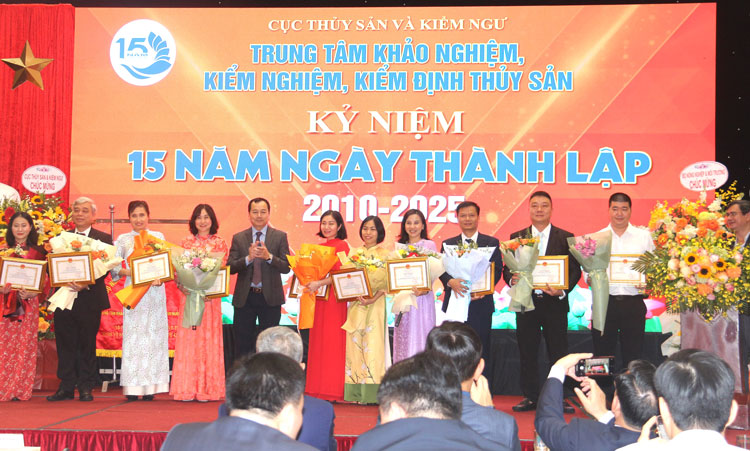 Nhân dịp kỷ niệm 15 năm thành lập Trung tâm, Bộ trưởng Bộ NN&PTNT đã có Quyết định số 670/QĐ-BNN-TCCB ngày 17/02/2025 tặng thường Trung tâm Cờ Tuyên dương – 15 năm xây dựng và phát triển, là đơn vị sự nghiệp công lập tự chủ nhóm 1; Quyết định số 712/QĐ-BNN-TCCB ngày 18/02/2025 tặng thưởng Bằng khen của Bộ trưởng cho 02 tập thế và 05 cá nhân thuộc Trung tâm đã có thành tích xuất sắc trong đánh giá, phân tích, khảo nghiệm, kiểm nghiệm, kiểm định nuôi trồng thủy sản, góp phần vào sự phát triển của ngành nông nghiệp và phát triển nông thôn; Quyết định số 672/QĐ-BNN-TCCB ngày 17/02/2025 tặng Kỷ niệm chương “Vì sự nghiệp Nông nghiệp và Phát triển nông thôn” cho 19 cá nhân thuộc Trung tâm đã có công lao đóng góp đối với sự nghiệp phát triển nông nghiệp và nông thôn Việt Nam.