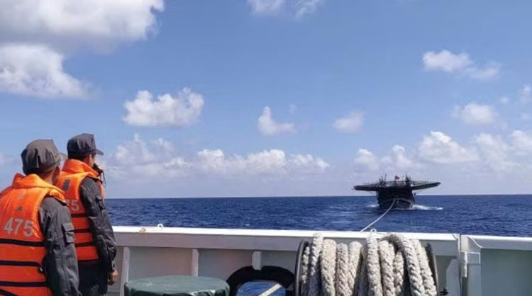 Tàu KN 475 đang lai kéo tàu cá gặp nạn về đảo Đá Tây A. Ảnh: Báo Nhân dân