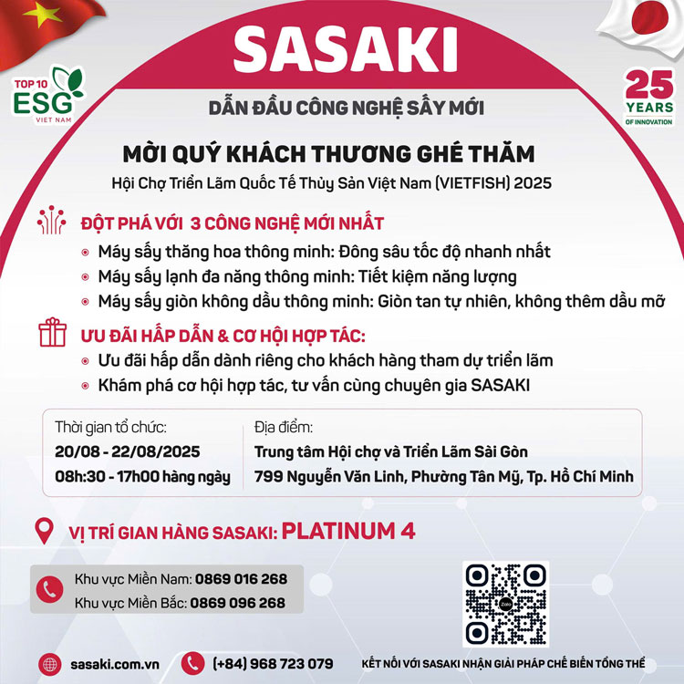 (TSVN) – Vietfish 2025 tại SECC (20-22/8/2025) không chỉ là nơi giao thương mà còn là diễn đàn công nghệ quan trọng của ngành thủy sản. Tại đây, SASAKI, với hơn 25 năm kinh nghiệm sản xuất và xuất khẩu các sản phẩm công nghệ cho thị trường Nhật Bản, châu Âu, sẽ mang đến các giải pháp sấy tiên tiến, giúp các doanh nghiệp giải quyết triệt để bài toán nâng cao giá trị và chất lượng sản phẩm xuất khẩu.