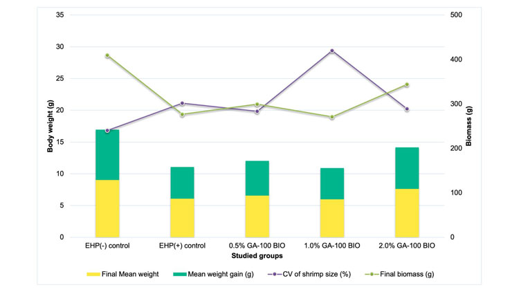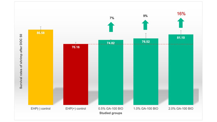 Sau giai đoạn gây nhiễm, nhóm “Đối chứng dương” (không xử lý) xuất hiện các triệu chứng lâm sàng điển hình của EHP như: Đường ruột rỗng, vỏ mềm và mô gan tụy nhợt nhạt. Ngược lại, các nhóm được bổ sung GA-100 BIO cho kết quả khả quan hơn rõ rệt. Kết thúc 28 ngày sau gây nhiễm, nhóm tôm sử dụng GA-100 BIO với liều lượng 2.0% đạt tỷ lệ sống trên 80%, cao hơn đáng kể so với nhóm đối chứng.