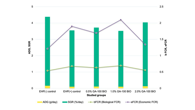 – Tăng trọng vượt trội: Nhóm bổ sung 2.0% GA-100 BIO đạt trọng lượng cuối và tổng sinh khối cao nhất.