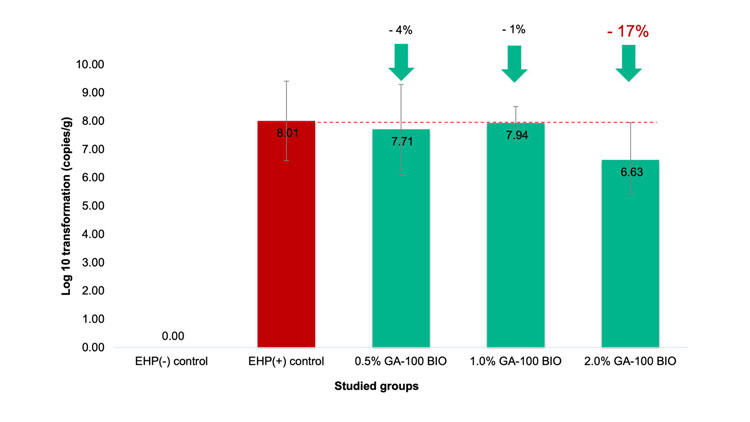 Khi phân tích mẫu gan tụy bằng phương pháp qPCR để xác định tác động của GA-100 BIO lên mật độ tác nhân gây bệnh, kết quả cho thấy liều lượng 2.0% đã ức chế hiệu quả sự nhân bản của EHP. Cụ thể, mật độ EHP được duy trì ở mức thấp hơn đáng kể (khoảng $106$ copies/g) so với nhóm đối chứng không xử lý (đạt mức xấp xỉ $108$ copies/g).