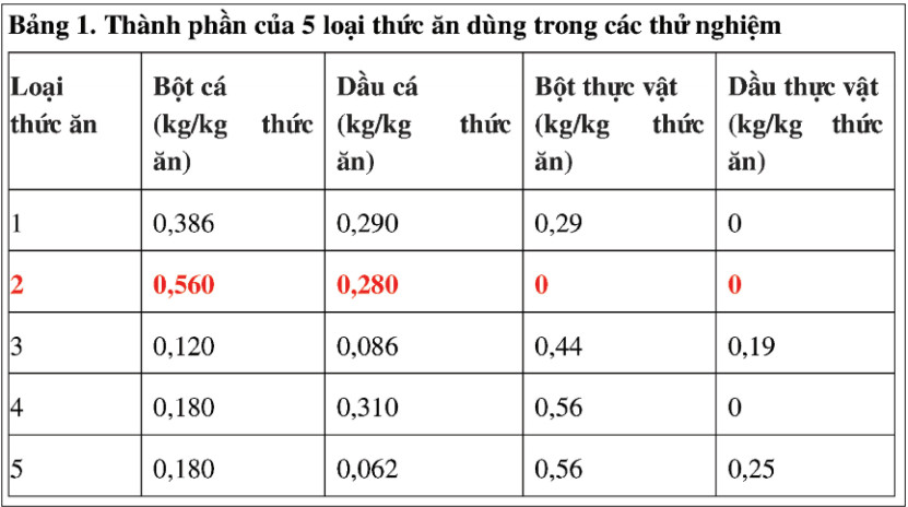 Ở thức ăn 1, 3, 4 và 5, nguyên liệu thô từ cá tự nhiên được thay thế bằng dầu thực vật và/hoặc bột thực vật. Hệ số chuyển đổi thức ăn (FCR) của các loại thức ăn lần lượt như sau: FCR1 = 1,2; FCR2 = FCR3 = 0,9; FCR4 = FCR5 = 1,2.