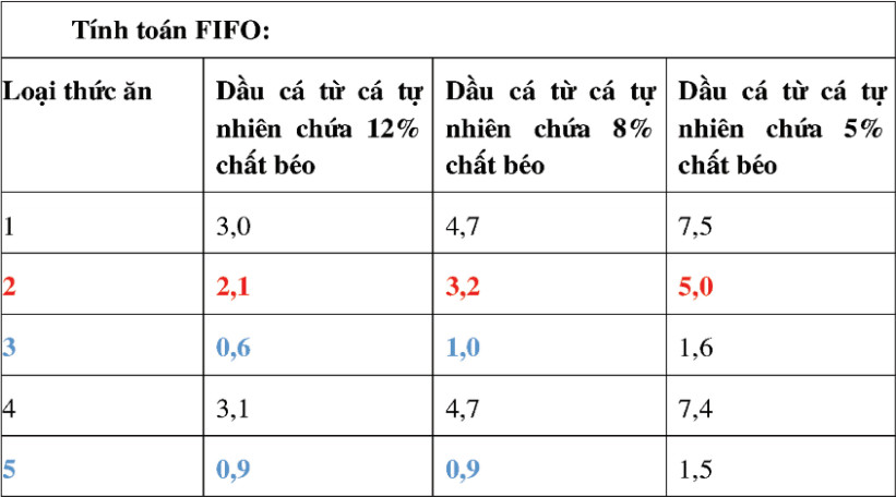 FIFO được tính từ 5 loại thức ăn được sử dụng trong các dự án nghiên cứu khác nhau với 3 mức tỷ lệ dầu cá có trong cá tự nhiên là 5%, 8% và 12%. Các yếu tố thức ăn thực tế từ các thử nghiệm được sử dụng để tính FIFO.
