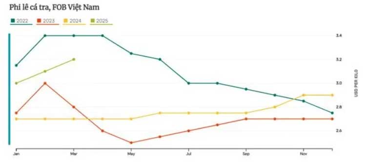 Biểu đồ diễn biến giá phi lê cá tra xuất khẩu (FOB) từ Việt Nam giai đoạn 2022-2025. Ảnh: VASEP.