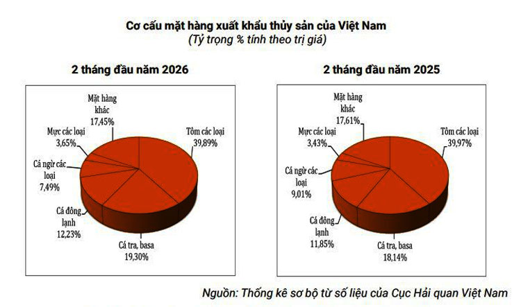 (TSVN) – Theo số liệu thống kê từ Cục Hải quan Việt Nam, xuất khẩu thủy sản của Việt Nam trong 2 tháng đầu năm 2026 đạt 369,6 nghìn tấn, trị giá 1,71 tỷ USD, tăng 17,7% về lượng và tăng 20,3% về trị giá so với cùng kỳ năm 2025.