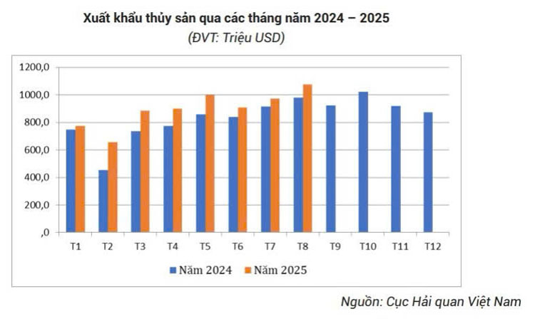 (TSVN) – Theo số liệu mới nhất từ Cục Hải quan Việt Nam, kim ngạch xuất khẩu thủy sản của Việt Nam trong tháng 8/2025 đạt 1,07 tỷ USD, tăng 9,4% so với cùng kỳ năm 2024. Lũy kế 8 tháng đầu năm, xuất khẩu thủy sản đạt 7,15 tỷ USD, tăng 13,5% so với cùng kỳ, cho thấy đà phục hồi mạnh mẽ của ngành sau giai đoạn khó khăn.