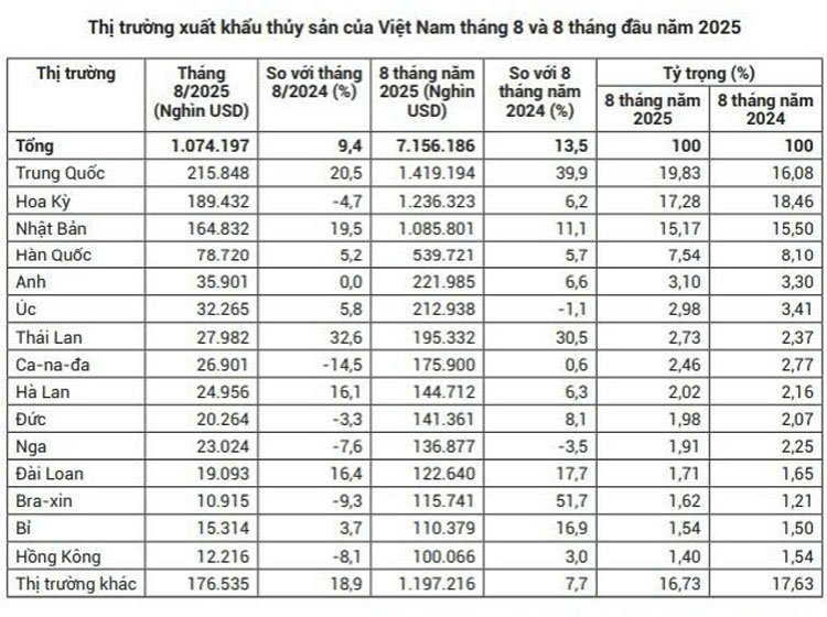 Tính chung 8 tháng, Trung Quốc tiếp tục giữ vị trí là thị trường nhập khẩu thủy sản lớn nhất của Việt Nam, chiếm gần 20% tổng kim ngạch. Hoa Kỳ đứng thứ hai với 17,28%, tiếp theo là Nhật Bản chiếm 15,17% và Hàn Quốc 7,54%. Ngoài ra, nhiều thị trường khác như Anh, Australia, Canada, Đức và Hà Lan cũng ghi nhận sự gia tăng nhập khẩu, góp phần đa dạng hóa thị trường và giảm phụ thuộc vào một số đối tác truyền thống.