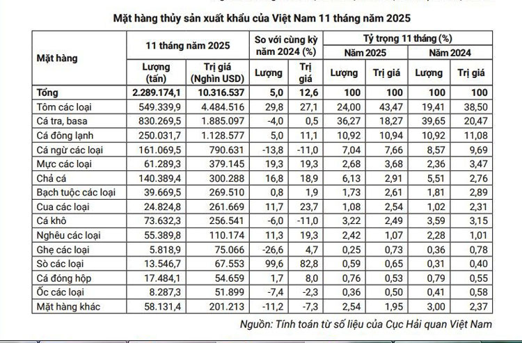 Theo số liệu thống kê của Cục Hải quan, lũy kế 11 tháng năm 2025, Việt Nam xuất khẩu 2,28 triệu tấn thủy sản, đạt 10,31 tỷ USD, tăng5% về lượng và 12,6% về trị giá so với cùng kỳ năm ngoái. Riêng tháng 11, hoạt động xuất khẩu tiếp tục ổn định và đóng vai trò quan trọng trong việc củng cố đà tăng trưởng chung của toàn ngành, trong bối cảnh nhu cầu tại nhiều thị trường lớn có dấu hiệu phục hồi rõ nét vào những tháng cuối năm.